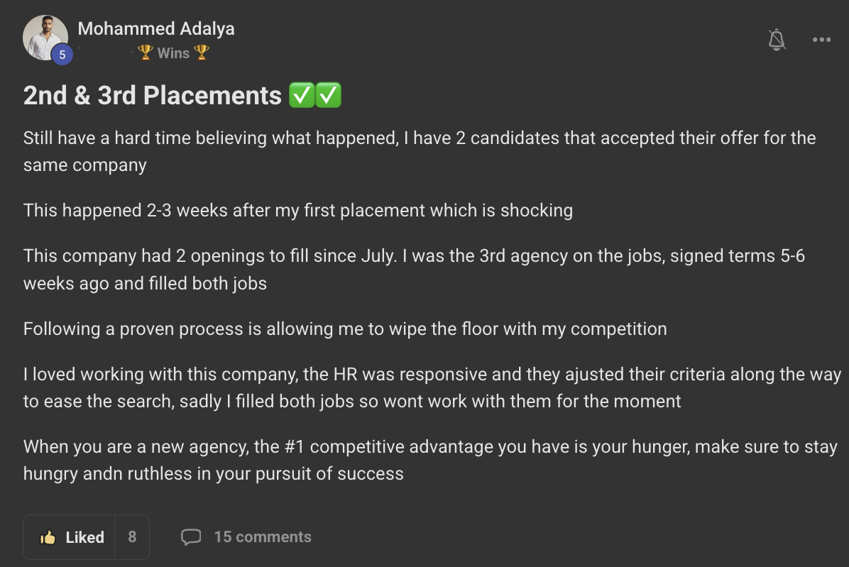 My name is Mohammed Adris. I've built multiple six-figure months while working 3 hours a week, not a day, a week, and I've partially exited my agency. Grew it to 7 figures. London's most recommended built environment recruiter.The difference between me and most people teaching recruiters? I'm still recruiting. Not someone who recruited for two years, burnt out, then sold a course. I'm in the trenches. Still billing £100K+ months.And I'm helping solo recruiters and small agencies land an extra 2–4 placements a month, hitting £30K, £40K, £50K, even £100K+ months, consistently, predictably, while doing less work.